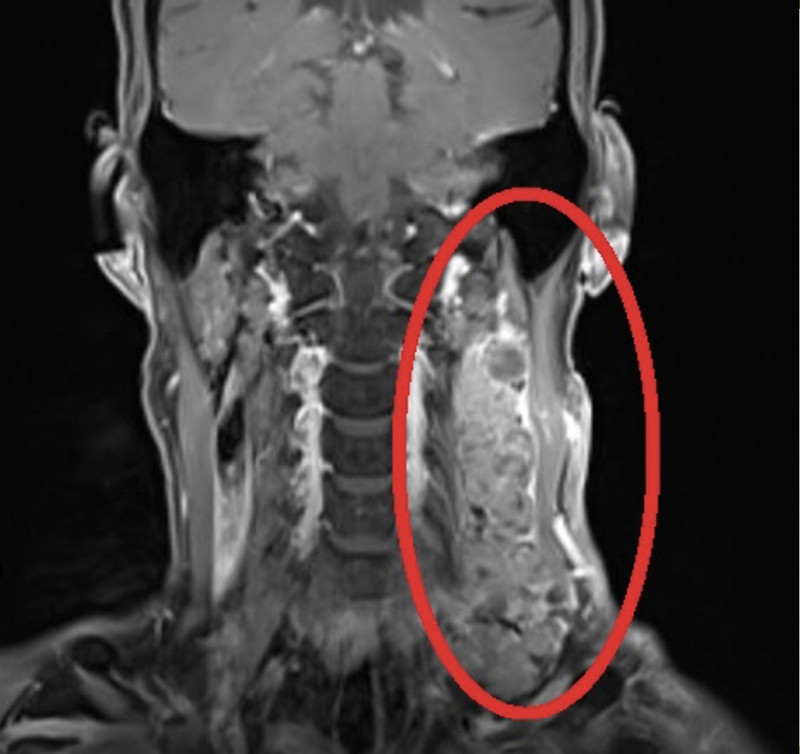 患者因妻子日前過世,讓他更注意自己的健康,因此在盥洗照鏡子時注意頸部左右側不對稱,確診後因腫瘤緊鄰頸動脈,先進行放化療,縮小腫瘤後,再評估是否開刀。