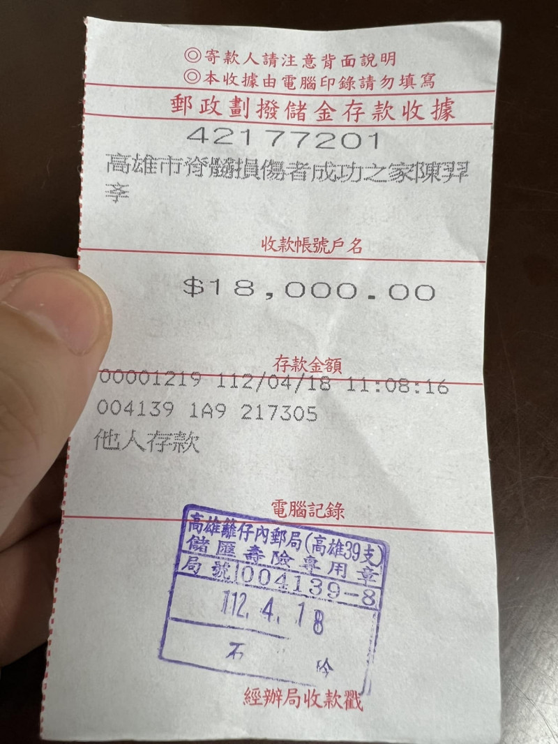 〔記者王榮祥/高雄報導〕民進黨高市議員陳致中今PO出收據,指出把全家3人「6000全民共享普發現金」加總共18000元,全數捐贈給高雄市脊髓損傷者成功之家,作為脊髓損傷朋友添購生活輔具的用途,他說,家母也是脊髓損傷者,對病人不便感同身受。