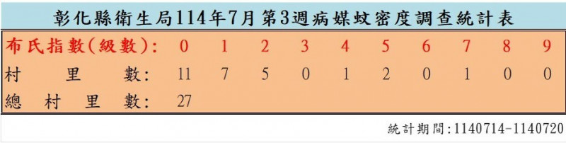 衛生局指出,今(2025)年因颱風多、雨勢頻繁,容易造成積水孳生蚊蟲,最新公布7月份第3週病媒蚊密度調查發現,全縣26鄉鎮中,有4個村里達4級以上登革熱紅燈警戒區,最高為永靖鄉獨鰲村的第7級,屬高風險區;其次為埤頭鄉合興村、永靖鄉竹子村的第5級,福興鄉外中村則為第4級。