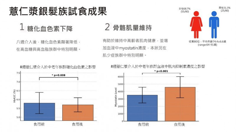 也因國產紅薏仁有完整麩皮,因此質地堅硬,必須充分浸泡才方便烹煮,為更方便食用,台中場研發全榖紅薏仁漿,並和台北榮總合作人體試食試驗,台中場指出,該試驗結果顯示,平均年齡74歲的受試者每日飲用兩份(每份290cc)全榖紅薏仁漿,8週後糖化血色素平均降低0.1%,其中高血糖與高血脂患者降幅更達0.2%;受試者骨骼肌質量下降趨勢獲得延緩,肌肉生長抑制素(myostatin)濃度提升,該指標與中老年人肌肉量維持密切相關,顯示紅薏仁漿具備成為銀髮友善營養補充品的潛在應用價值。