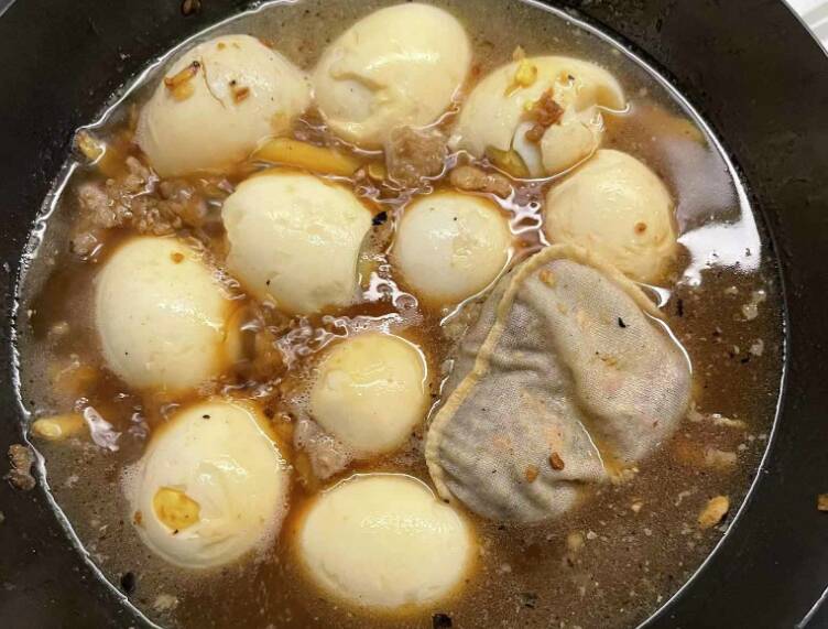 林本庭也分享滷蛋秘方:先將肉末與蒜頭炒香,再放入水煮蛋與調味料,加入蠔油3大匙、醬油2大匙、冰糖1小匙、開水600毫升,最後搭配滷包(八角、甘草、月桂葉、草果、桂皮、小茴香、花椒)小火熬煮2小時即可。
