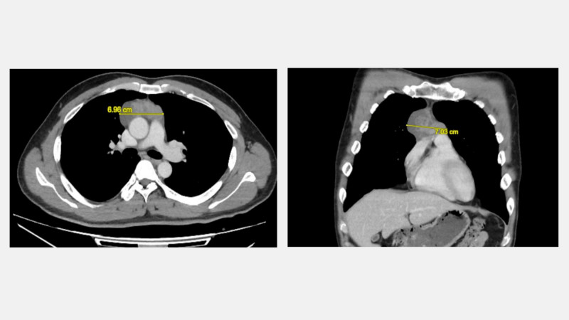 〔記者陳建志/台中報導〕68歲陳先生日前接受國民健康署補助的低劑量胸部電腦斷層掃描,意外發現縱膈腔內有一顆約7公分的腫瘤,雖未出現任何胸悶、咳嗽等症狀,但醫師研判可能是胸腺瘤,若不及時處理,恐會壓迫心臟、氣管或其他器官,胸腔及心臟血管外科醫師決定以健保給付的達文西機器人手術系統精準切除胸腺瘤,讓他順利康復,重拾健康生活。