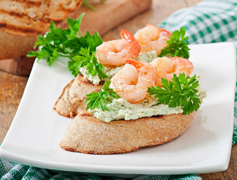 5.取一片黑麥吐司,依序放上酪梨沙拉與蝦仁,撒點黑胡椒,就能享用!