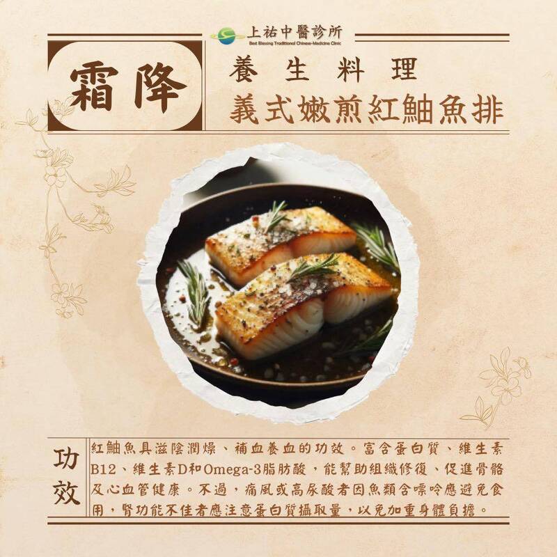 〔健康頻道/綜合報導〕霜降是秋季最後一個節氣,天氣轉冷、陰氣漸盛。上祐中醫診所院長黃上邦提到,民間有「補冬不如補霜降」之說。此時可適量食用枸杞、紅棗、山藥、桂圓、薑等溫補食材,藉食療增強抵抗力以迎冬,但進補應視個人體質,避免過量造成負擔。他也推薦潤肺益目茶、疏肝安神茶、強身健體茶和義式嫩煎紅鮋魚排;適合秋天的飲食。