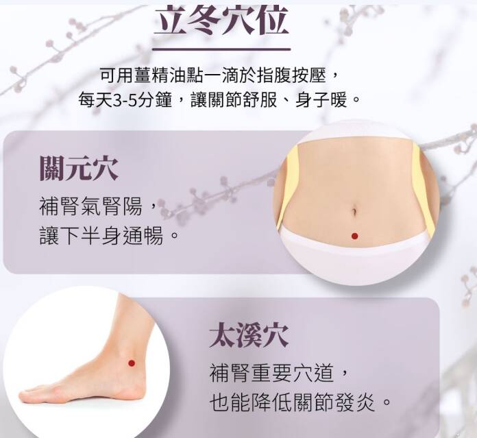 推薦可以用薑的精油點一滴於指腹按壓關元、太溪穴,每天3-5分鐘,關節舒服,身子暖。