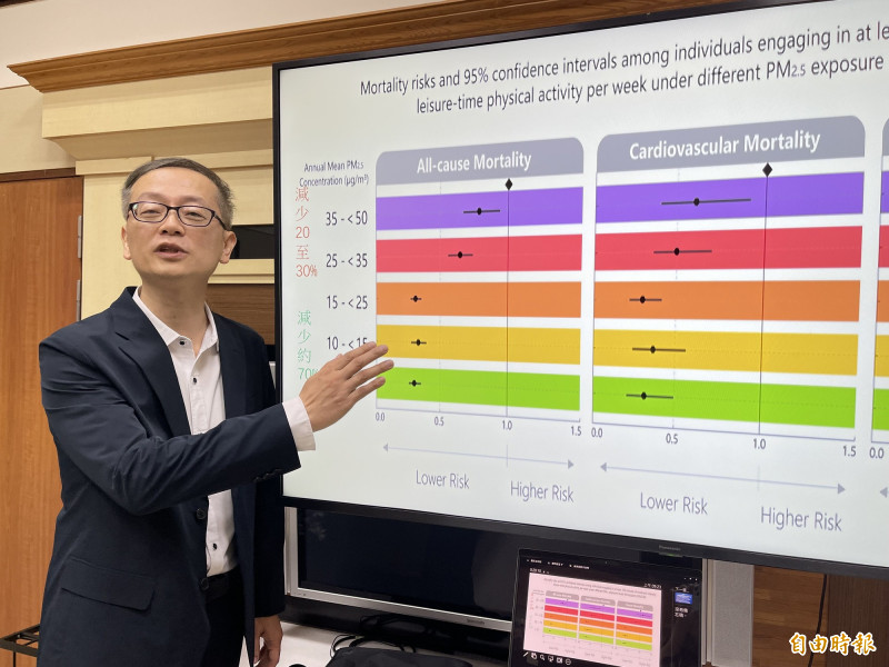 近年台灣空氣品質明顯改善,PM2.5年平均濃度皆已降至25μg/m³ 以下,古博文指出,PM2.5濃度會隨季節、天候、地形、交通流量或附近有工廠等局部污染變動,這項研究是根據PM2.5的長期平均濃度進行分析,並非每日或即時濃度,建議民眾運動前養成查看「即時空氣品質指標」的習慣,拚健康最好在「好空氣 + 規律運動」下進行。