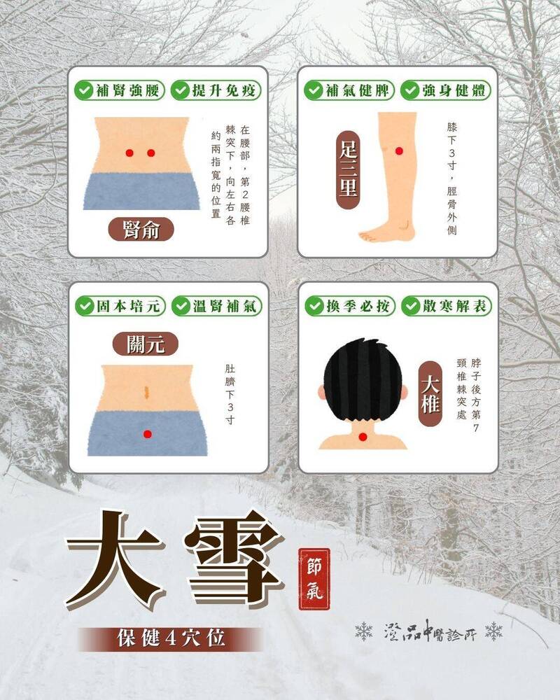 〔健康頻道/綜合報導〕大雪節氣今(7)日到來,代表寒冬正式來臨,也是進補與養腎的黃金時機。澄品中醫指出,當天氣愈來愈冷時,身體陽氣容易外散,免疫力也會跟著下降。因此,建議此時可透過養生及簡單按摩腎俞、足三里、關元、大椎等穴位,有助暖身補氣、提升抵抗力,如同幫身體開啟暖爐,勝過喝補湯,也能趕走冬季帶來的不適。