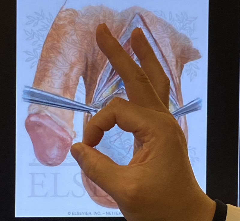 陳卷書指出,正常男性的睪丸為左右各一,存於陰囊內,尺寸約4×3×2.5公分,手指比出OK手勢大約是睪丸大小,可做為自我量測的方式,也應觸摸檢查,若有不明原因無痛變大,或是腫塊,應盡速檢查,也建議18歲以上男性可做精液檢查,可提早發現是否患有無精症。