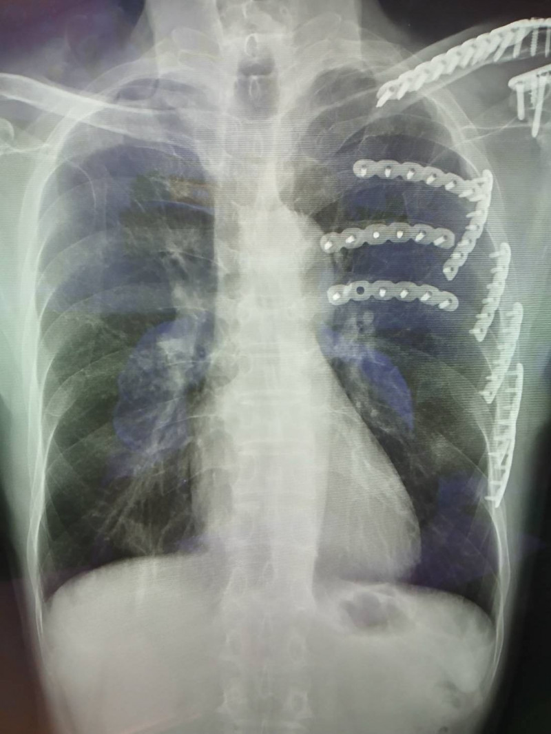 經評估後,決定採用「胸腔鏡輔助肋骨骨折復位矯正鋼板內固定手術」,術後患者的疼痛指數迅速降至3分,呼吸困難明顯改善,也能順利咳痰與進行肺部復健,住院兩週即順利出院。