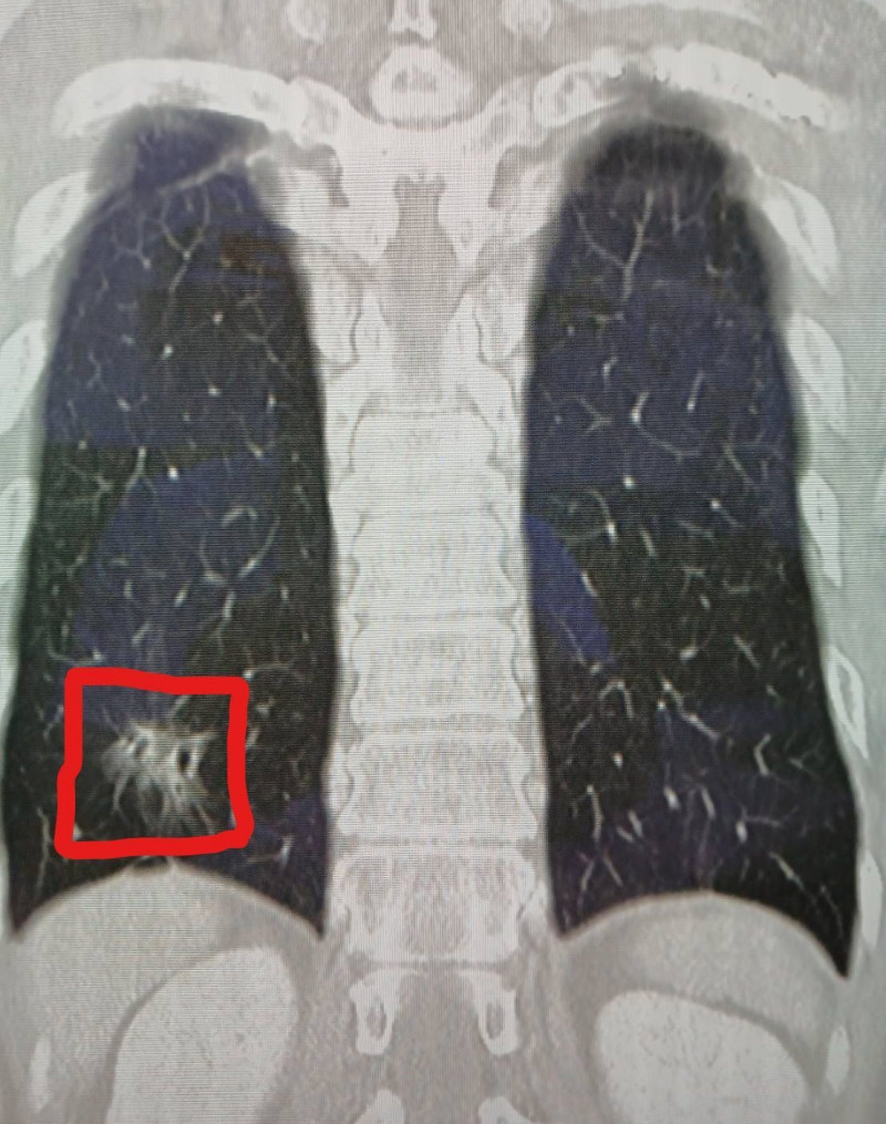 謝志明表示,醫療團隊在處理外傷的術前電腦斷層中,發現患者右下肺葉有疑似早期肺癌的毛玻璃樣病灶。待他肋骨傷勢穩定,3個月後回診追蹤時,檢查發現病灶依然存在。立即為他安排第2次「胸腔鏡微創手術」切除病灶,病理報告證實為肺腺癌第1期。