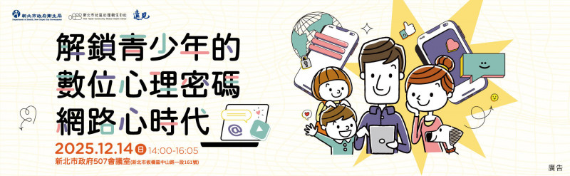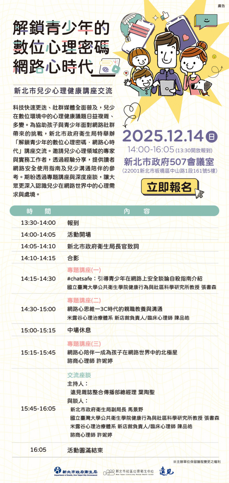 為回應3C時代青少年的心理挑戰,衛生局14日在新北市政府507會議室舉辦「新北市兒少心理健康講座交流:解鎖青少年的數位心理密碼·網路心時代」。活動邀請台灣大學公共衛生學院教授張書森介紹《#chatsafe:引導年輕人在網路上安全談論自傷與自殺的指南》,協助青少年在網路上安全表達與討論敏感訊息。
