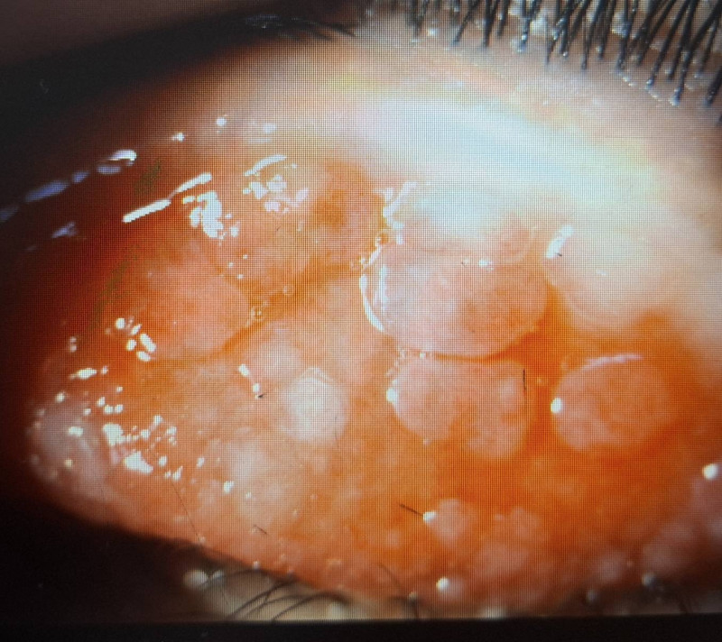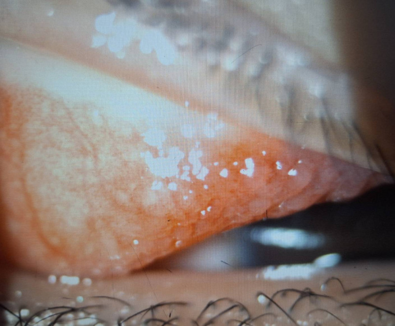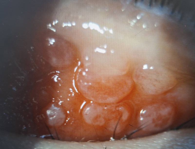 達特楊眼科聯盟執行長洪啟庭指出,小二男童就醫時不僅左眼眼瞼嚴重腫脹,最佳視力僅0.5並有300度散光,應是過敏性結膜炎合併過敏性鼻炎、濕疹、異位性皮膚炎或氣喘等,因為長期揉眼導致眼皮長滿巨大乳突,因長時間壓迫造成上半部角膜有淺層潰瘍,故造成300度的高度散光和視力模糊,經強效抗生素與適當類固醇藥水治療,2星期後角膜潰瘍痊癒,乳突的也變小,學童眨眼睛的現象也明顯改善,但乳突完全消失恐要半年以上。