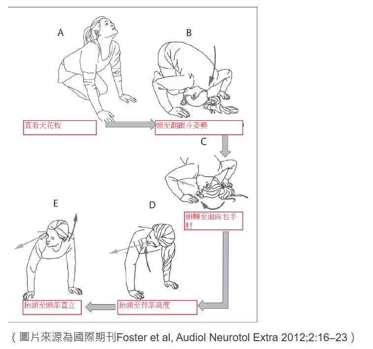 ●迅速抬起頭來到直立狀態,保持頭轉到右肩。在眩暈平息後,在慢慢的頭轉回正位,然後坐下來。
