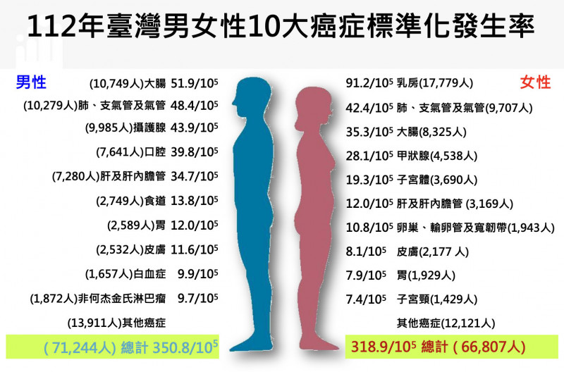 進一步區分性別來看,112年男性新發癌症人數為71,244人,年齡標準化發生率為每10萬人口350.8人,較111年增加8.5人。男性癌症發生率順位與前一年相同,依序為大腸癌、肺癌、攝護腺癌、口腔癌、肝癌、食道癌、胃癌、皮膚癌、白血病及非何杰金氏淋巴瘤。