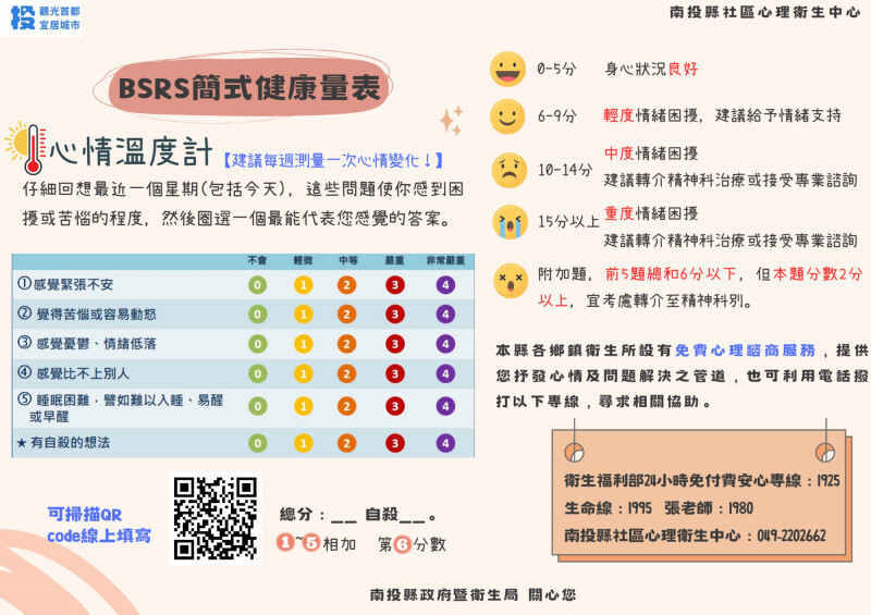 衛生局長陳南松表示,老年憂鬱症常以「身體不適」為主要表現,容易被誤認為一般生理疾病或老化現象,甚至被誤解為「老番癲」或假性失智,因此家中長輩如果出現持續性的情緒低落、不明原因疼痛或無望感,建議家人利用「心情溫度計(BSRS-5)」協助檢測,必要時應洽詢各地衛生所,尋求社區心理健康諮商服務,如健康促進活動及心理諮商,或透過醫師予以藥物、心理治療,使老年憂鬱得到緩解,恢復生活品質。