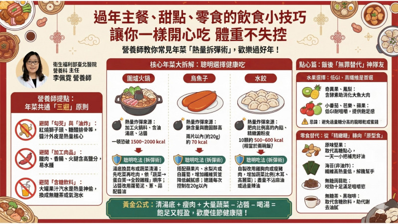 〔記者黃政嘉/新北報導〕農曆春節圍爐少不了豐盛年菜、甜點零食,但要小心大快朵頣之際,體重失控。衛生福利部台北醫院營養科主任兼營養師李佩霓指出,守住「三避」原則,包括避油炸、避加工肉類、避含糖飲料,就能輕鬆成為熱量拆彈專家。