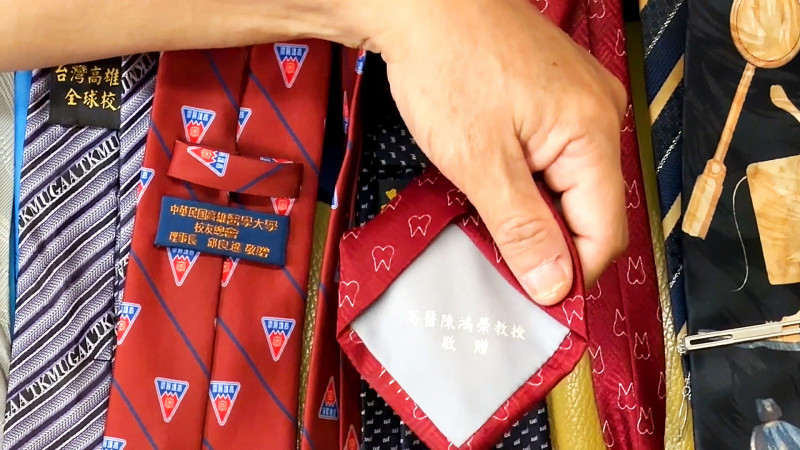 蔡政峰說,目前收藏的領帶超過30、40條,但自己買的大概不到10條,其他都是別人送的「勳章」,這些領帶多是牙醫師公會、學會、社團、老師等具權力象徵者所贈送,上面都有送的人的名字,就像獎牌一樣,是對受贈者的認同,也是贈與者的認同,所以他覺得每一條都像是「勳章」。