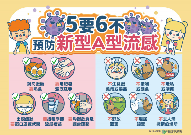 林明誠呼籲,民眾日常生活中只要確實遵守「5要6不」防疫原則,即可有效防範新型A型流感,降低感染風險,安心度過禽流感好發季節。5要:要確保禽肉蛋類完全熟食、要養成肥皂勤洗手習慣、出現症狀要戴口罩就醫、公費對象要定期接種流感疫苗、要均衡飲食與運動提升免疫力。6不:不生食禽蛋製品、不購買來路不明動物、不接觸或餵食禽鳥、不野放或隨意丟棄禽畜、不混居飼養禽畜、不前往空氣不流通或人潮擁擠場所。