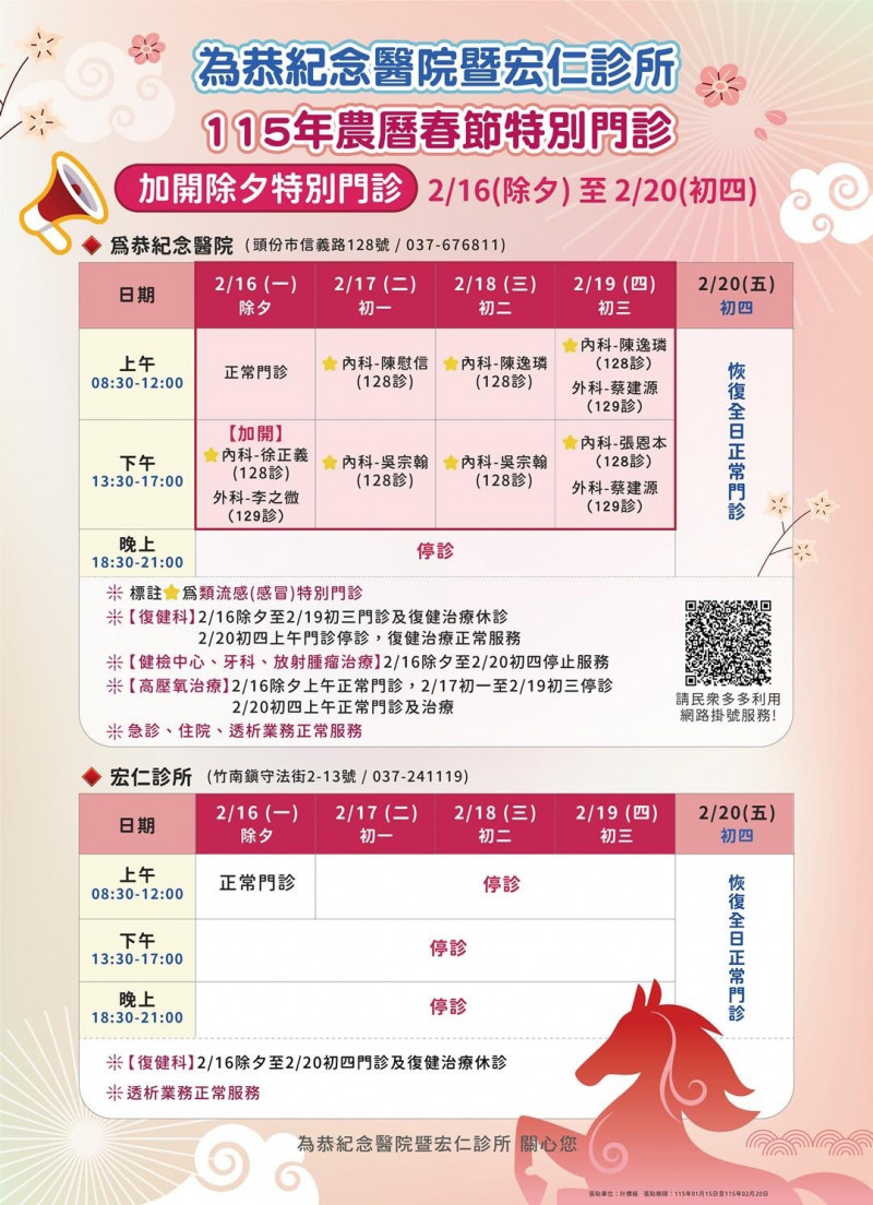 為恭醫院表示,除夕上午維持正常門診,除夕下午加開的門診內、外科皆有;初一與初二上、下午為內科門診;初三上、下午則提供內科與外科門診服務,且春節期間門診皆有類流感(感冒)特別門診服務,院方也提供急診、住院及必要醫療服務正常運轉。