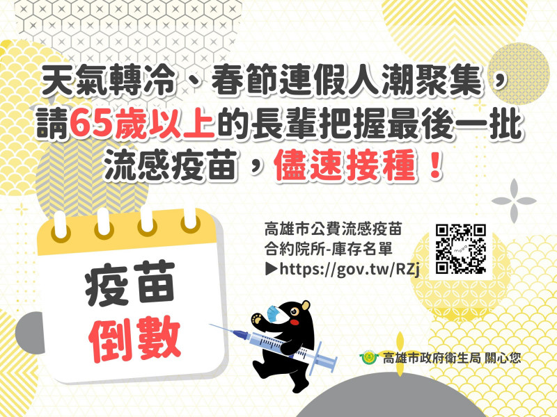 〔記者許麗娟/高雄報導〕114年度公費流感疫苗去年10月開打,高雄市衛生局指出,最後一批調配到貨僅餘約1000劑,預計春節前用罄,由於連假南來北往頻繁,呼籲高風險族群儘快於完成接種,以降低感染後的風險。