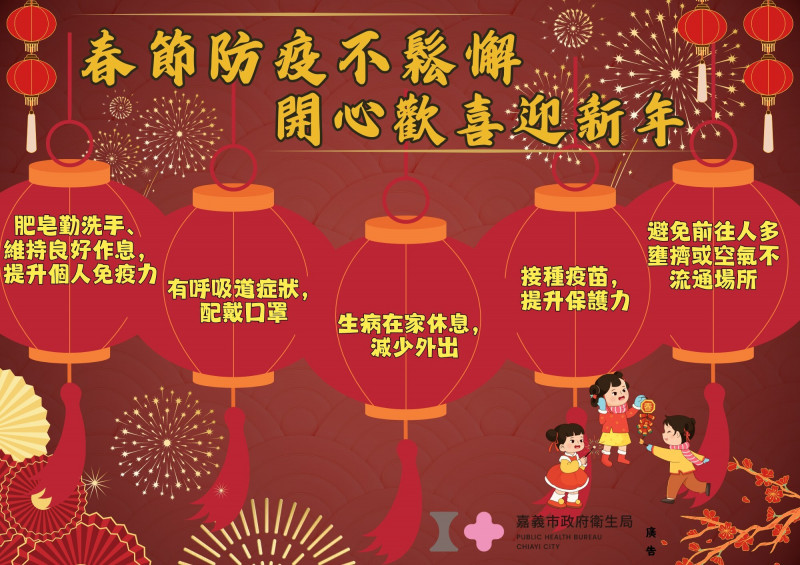 衛生局呼籲民眾,春節期間務必做好手部衛生與咳嗽禮節,於人潮壅擠處戴口罩,如有發燒、咳嗽等類流感症狀,請在家休息減少外出,若出現呼吸困難、胸痛、意識改變等危險徵兆,應儘速就醫,並配合醫師指示服藥,以降低併發重症風險。