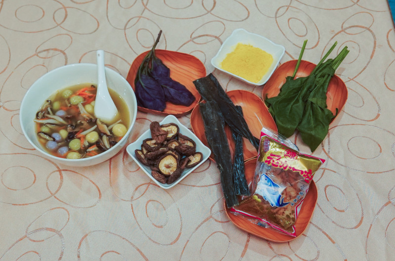 一、材料:昆布10克、柴魚5克、香菇、瘦肉絲、鴻喜菇、紅蘿蔔絲、水1000cc、養生湯圓。