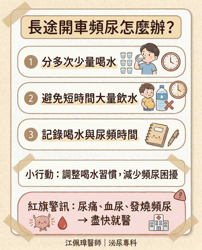 江佩璋在臉書粉專「江佩璋醫師.泌尿專科」表示,開長途車或參加會議時,膀胱頻頻發出求救聲,卻找不到合適的廁所,讓人緊張又分心。很多人誤以為多喝水對身體好,但短時間內喝太多,膀胱瞬間被灌爆,尿意反而更急更頻繁。