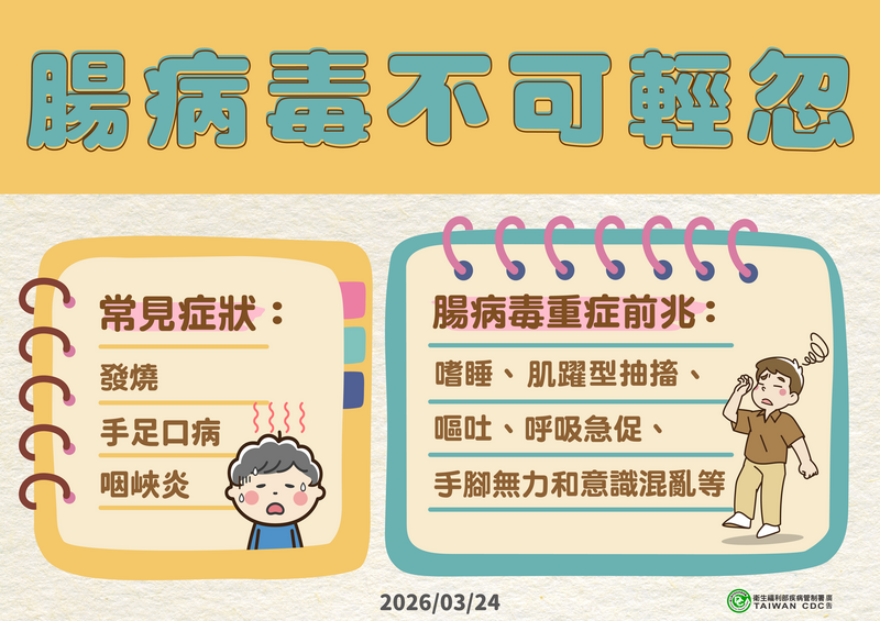 林明誠指出,5歲以下嬰幼兒為腸病毒重症高危險群,且病程可能快速惡化。家長若發現孩童出現嗜睡、意識不清、活力下降、手腳無力、肌抽搐、持續嘔吐、呼吸急促或心跳加快等症狀,應高度警覺,儘速送往大型醫院治療,以免錯過黃金救治時間。