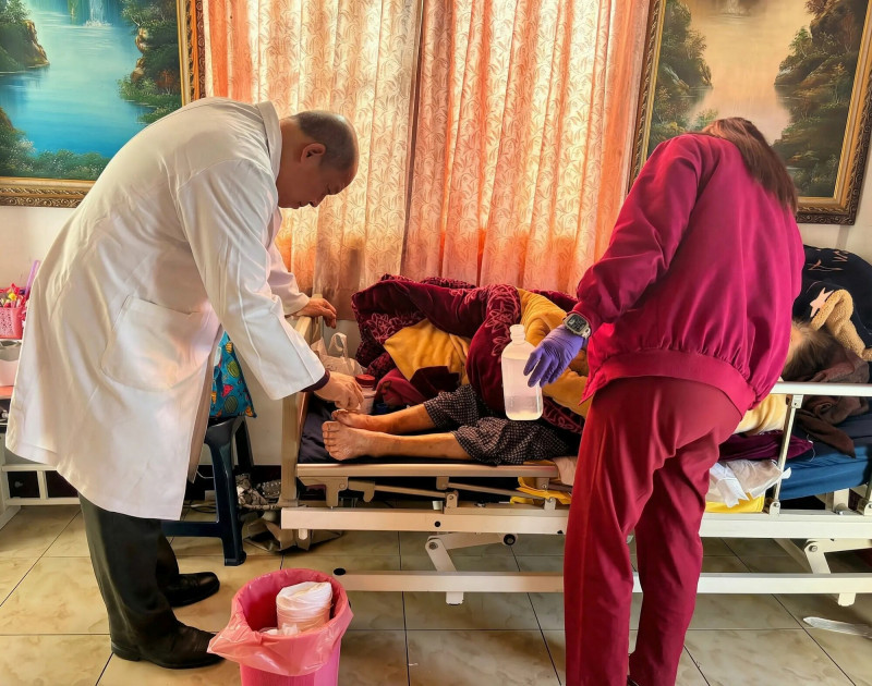 大千綜合醫院護理部督導陳嘉帆表示,一名84歲曾姓老婦患有高血壓,多年前因手術及膝關節退化,近年逐漸轉為長期臥床。雖然與兒媳同住,但家屬平日忙於工作,加上長輩行動不便,外出就醫相當困難。經醫療團隊評估後,老婦被納入居家照護計畫,由象鼻衛生室醫師及護理師定期到宅訪視,成為老婦及其家屬最重要的專業支持。