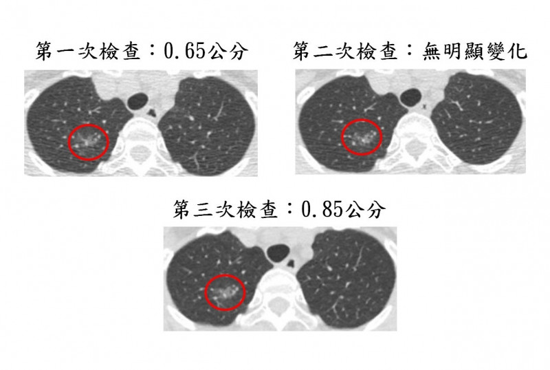 該名56歲女性病人本身不吸菸,但因慢性咳嗽持續3個月就醫。初步X光檢查並無異樣,但醫師考量其家族史顯著,兄姊分別患肺癌、鼻咽癌、乳癌,因此安排公費LDCT檢查,結果發現約0.65公分病灶。安排半年後第二次追蹤,病灶無明顯變化,但再半年後的第三次追蹤,病灶已增長至0.85公分。