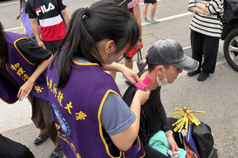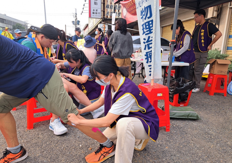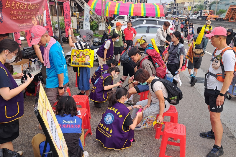 〔記者歐素美/台中報導〕大甲媽遶境進香,弘光科技大學物理治療系副教授楊文傑率領18名學生,組成「與神同行勇腳防護隊」,提供香客專業的運動貼紮服務,師生發現香客們第一天即步行30公里左右,因長時間行走,造成小腿痠痛、關節腫脹及肌肉緊繃等問題,還有人因未慎選鞋襪,腳磨破皮又起水泡,安全防護的需求極為迫切。