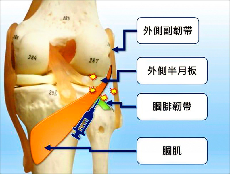 超音波檢查發現外側半月板和膕腓韌帶(如圖)皆有損傷,也合併十字韌帶扭傷。經超音波導引自體血小板血漿注射上述患部後,並搭配徒手運動治療,疼痛與角度受限的情況慢慢改善。