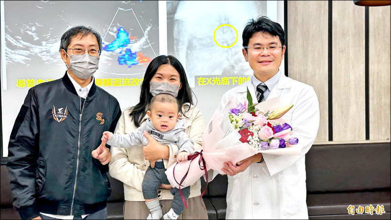 男嬰與父母昨天回到奇美醫院,向陳俊宇獻花致謝。男嬰的父親說,新生兒檢查時發現寶寶有心雜音,哭聲無力、喝完奶之後秒睡,一開始以為只是小事,沒想到進一步檢查確診為開放性動脈導管,醫療團隊立即安排開刀治療後,約2個小時的手術期間,回想起來仍相當煎熬。現在寶寶已康復,回歸一般嬰兒的照顧模式,感謝醫療團隊的幫助。
