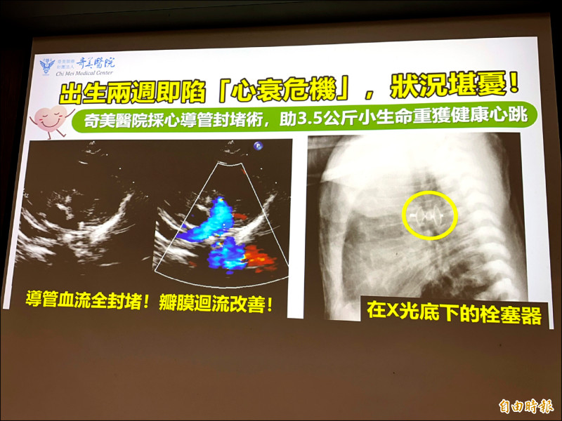 台南市1名出生2週、重3.5公斤的男嬰,因明顯心雜音就醫,經心臟超音波檢查,發現1條約3.5mm(公釐)的「開放性動脈導管」未閉合,造成左心室擴大、二尖瓣中重度閉鎖不全,伴隨心肌酵素上升與心臟功能下降,屬急性心臟衰竭,情況相當危急,在接受「心導管封堵術」後,目前寶寶已經5個多月大,體重穩定增加,生長良好。