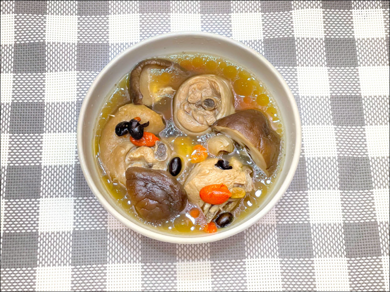 「桑寄生」性味苦甘平,可壯筋骨、祛風濕;「黑豆」性味甘寒,可利水下氣、鎮心明目;「枸杞子」性味甘平,可滋潤肝腎、益精明目;「生薑」性味辛溫,可發汗解表、溫中止嘔;「雞肉」性味甘溫,可溫中補虛、含蛋白質及維生素;「鮮香菇」含蛋白質、膳食纖維。
