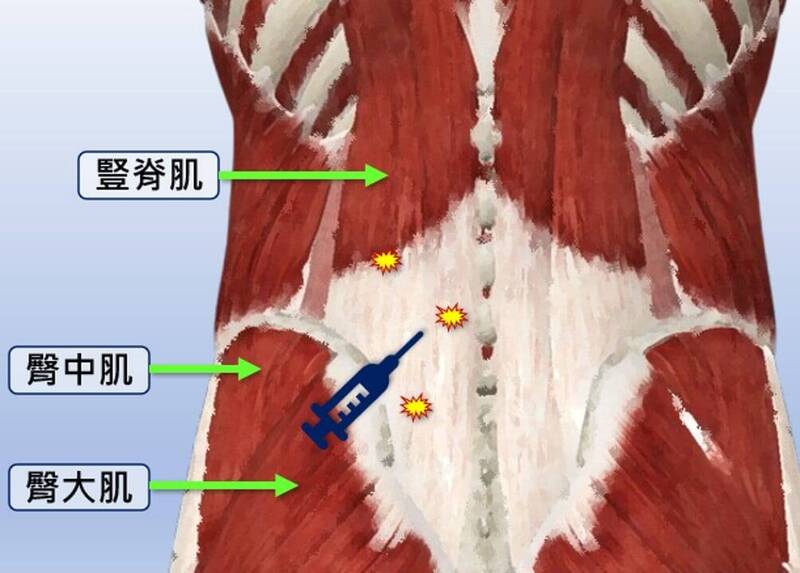 某次重量訓練進行硬舉後,下背部疼痛無法挺直,經醫師檢查後發現於右側腰椎肌肉緊繃,腰椎薦椎交接處的肌肉筋膜皆有壓痛感,超音波檢查後發現該處的豎脊肌、多裂肌出現撕裂傷(如圖),合併包覆於肌肉表層的胸腰筋膜撕損傷。在針對受傷處進行數次增生治療與自體血小板血漿注射後,症狀改善。