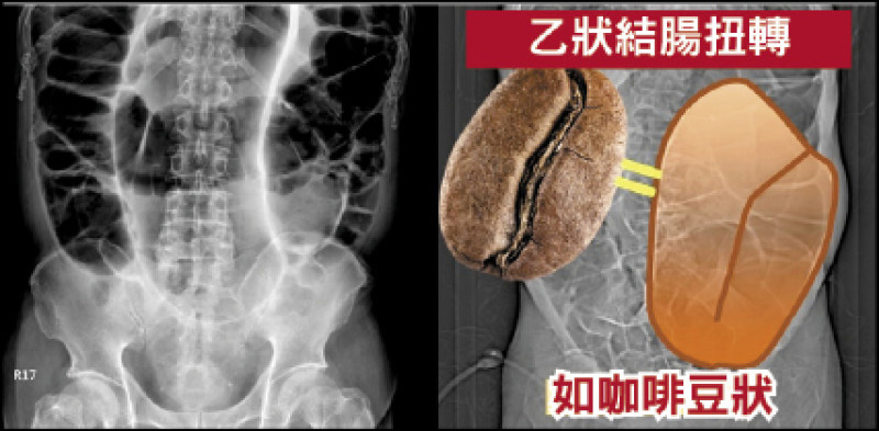 王心泰進一步說明,典型的乙狀大腸扭轉,在腹部X光上,會呈現倒U型或咖啡豆狀腸氣影像,若未及時處理,腸道血流中斷會導致缺血、壞死、破裂,進而引發腹膜炎或敗血症,死亡率高達7成。