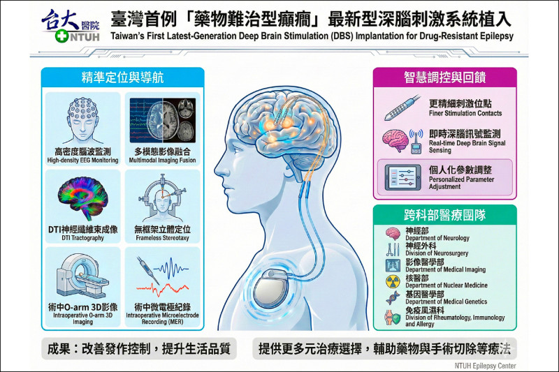 癲癇多數可透過藥物控制,但仍有一群病人,即使嘗試多種藥物、甚至接受手術,發作仍反覆出現,生活長期受限,台大醫院昨分享最新治療成果,團隊完成國內首例最新型深腦刺激系統(DBS)植入,成功應用於藥物難治型癲癇個案,為治療選項有限的患者帶來新希望。