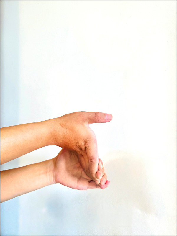 在日常照護上,最重要的是讓手部適度休息,避免短時間內重複相同動作。急性疼痛時可冰敷減緩發炎,症狀較緩和後則可改以溫敷及拉伸動作(圖4)促進放鬆。必要時,配戴護腕以減少拇指與手腕的負擔,幫助恢復。