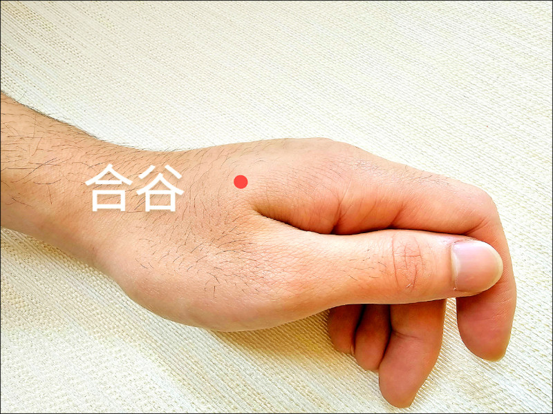 ●合谷:將拇指與食指併攏,虎口處出現的隆起最高點,用另一手的拇指於此點向食指側按壓,會覺很痠脹即是穴。