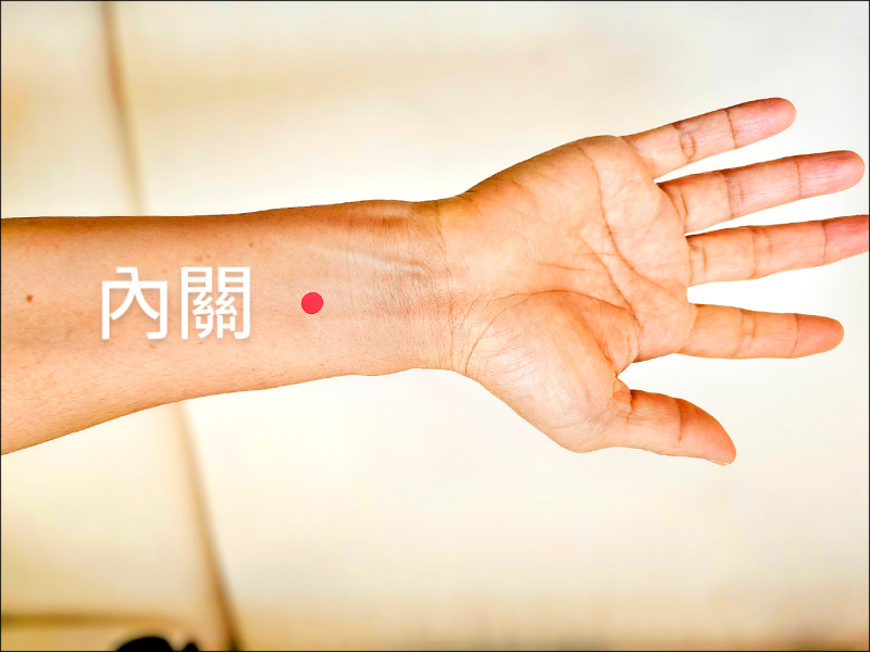 ●內關:位於下臂掌側兩條大筋之間,從腕橫紋向上三橫指高度。