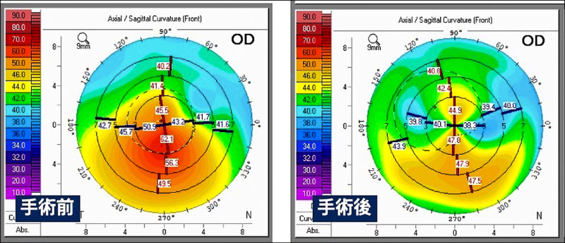 張小姐表示,高中時即發現散光度數偏高,4年間已達800多度,但因左眼視力尚可未特別追蹤。直到去年6月出現眼睛紅、癢等不適才就醫,經醫師評估與過敏體質及長期揉眼有關,推測反覆揉眼導致角膜結構受損、逐漸變形。她指出,術後隔天視力就提升至矯正視力0.4,目前已進步至0.5至0.6,夜間與雨天開車也不再吃力。